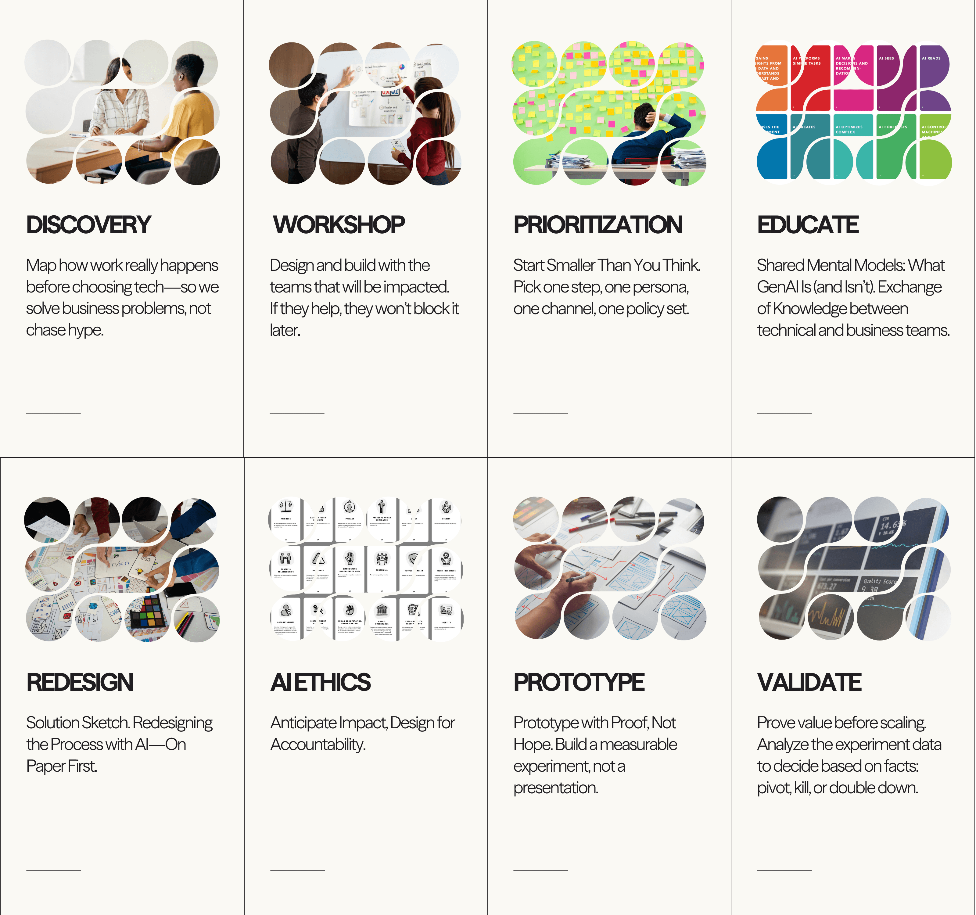 Unlike sweeping architectures and systems, the best results are achieved by solutions that focus on improving specific business problems. Thus, the method concludes with a validated prototype, where not only is a part of the software ready, but there is also clarity on the steps and investment necessary to scale the solution.