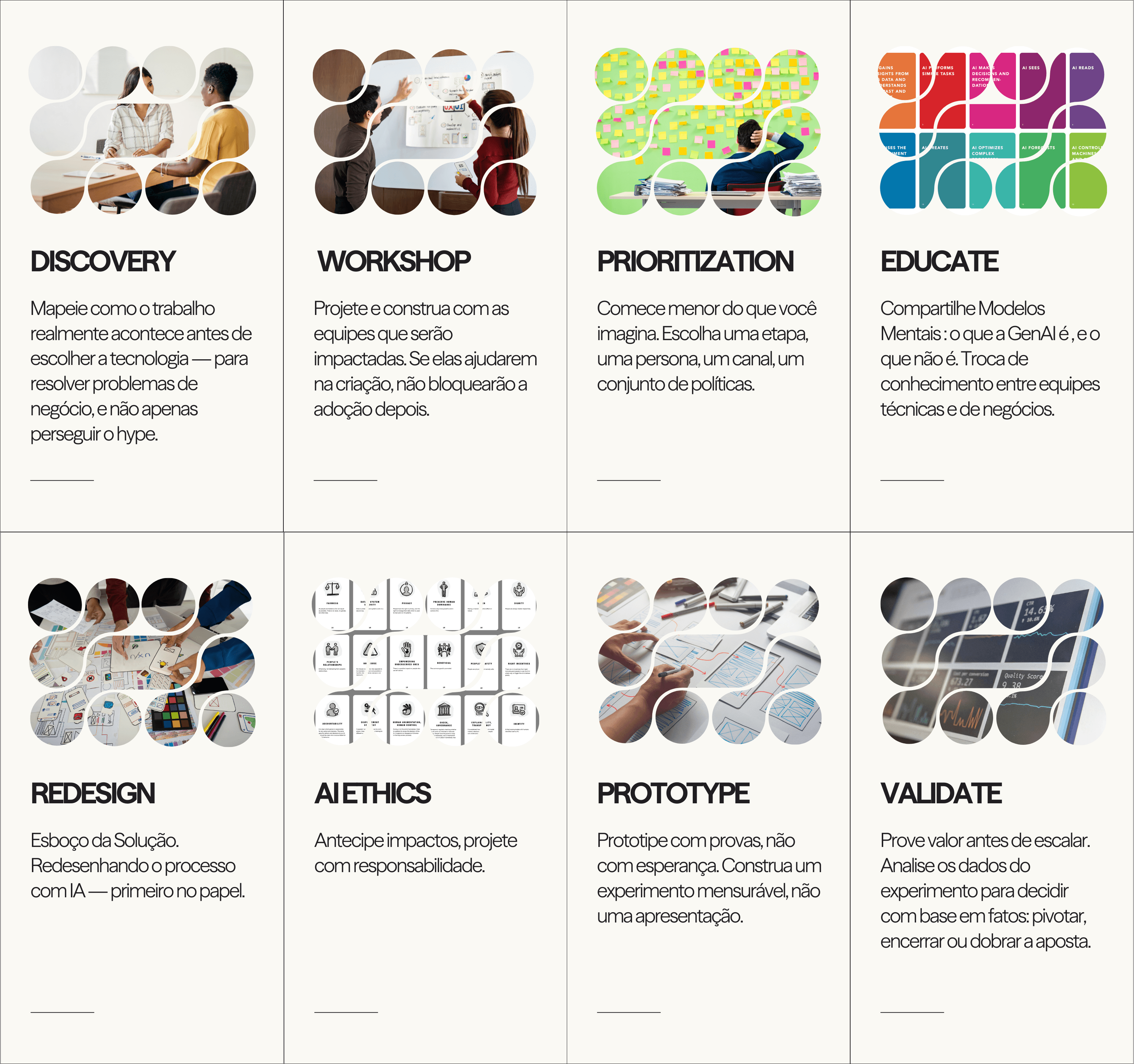 Considerando o contexto de negócio como algo fundamental para o sucesso das soluções com AI, nosso papel é não só ajudar a desenvolver, como contribuir para a autonomia das empresas com a tecnologia. Ao capacitar os times a incorporarem e inovarem com a tecnologia, o método acelera a adoção da tecnologia em enterprises, trazendo uma possibilidade concreta de como a empresa pode conquistar resultados com Inteligência Artificial.