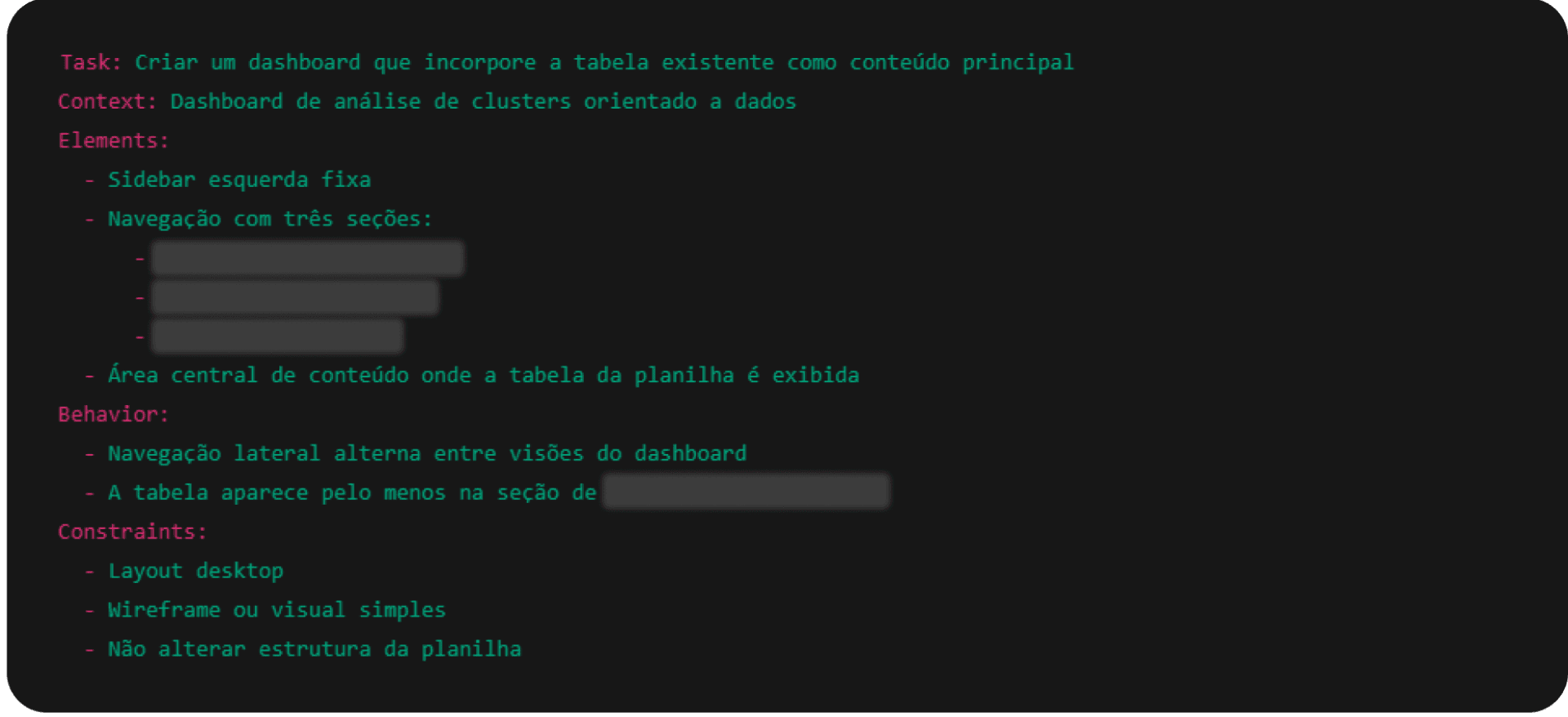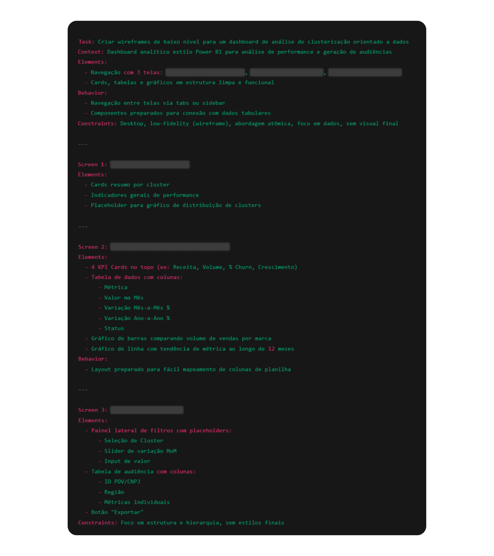Utilizando um resumo da transcrição da primeira reunião de alinhamento do projeto com o time (feito pelo Gemini) e o GPT Make Prompt Assistant para refinamento da estrutura do prompt, gerei um único comando detalhado contendo todas as informações que, em teoria, seriam necessárias para gerar uma boa versão inicial do dashboard.