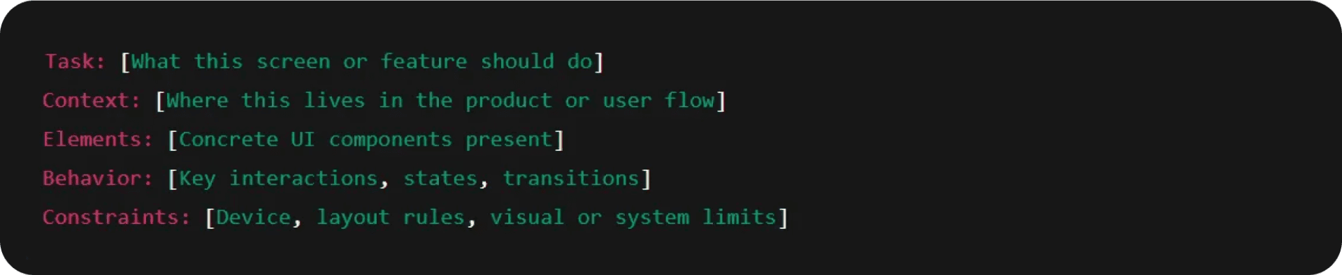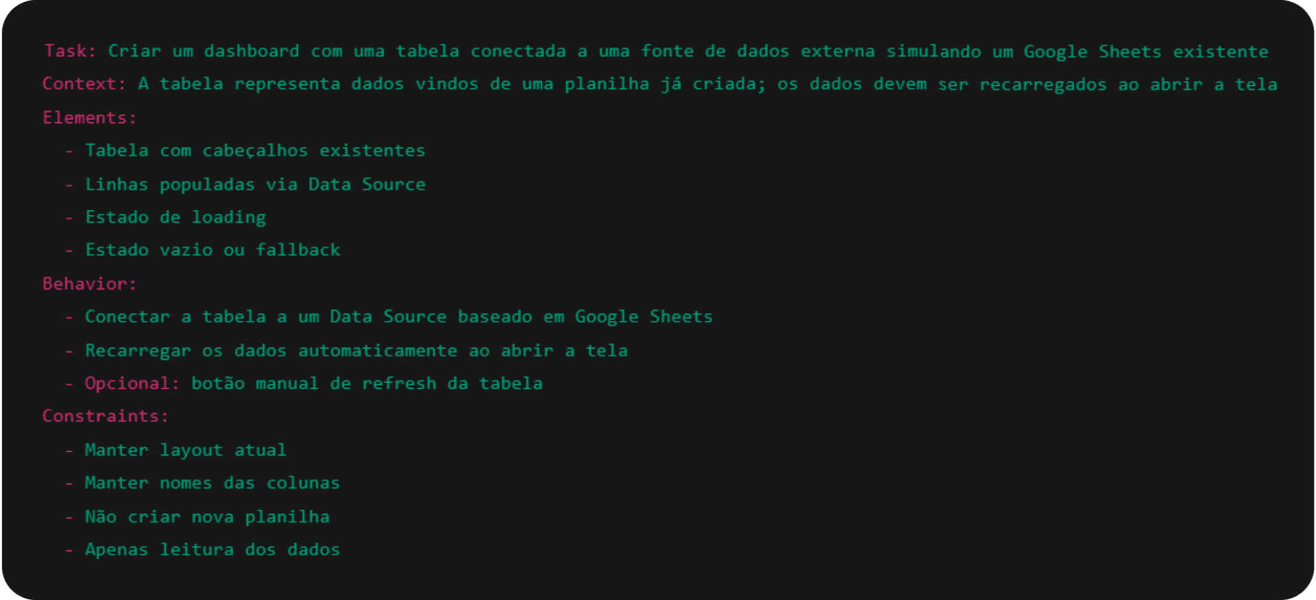 Um único prompt não resolve tudo, mas microajustes sucessivos também são um problema: Pequenos ajustes sem uma boa estrutura geram dezenas de novas versões do protótipo e tendem a produzir resultados inconsistentes no médio prazo. Comandos curtos, diretos, porém completos (com tarefa, contexto, elementos, comportamento e limitações), resultam em respostas mais coerentes e previsíveis.
