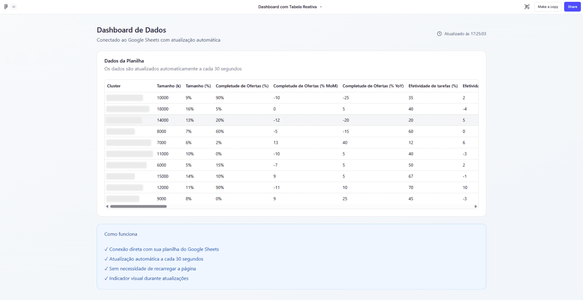 Testar a integração entre Figma Make e Google Sheets, construindo tabelas e gráficos alimentados por dados reais.